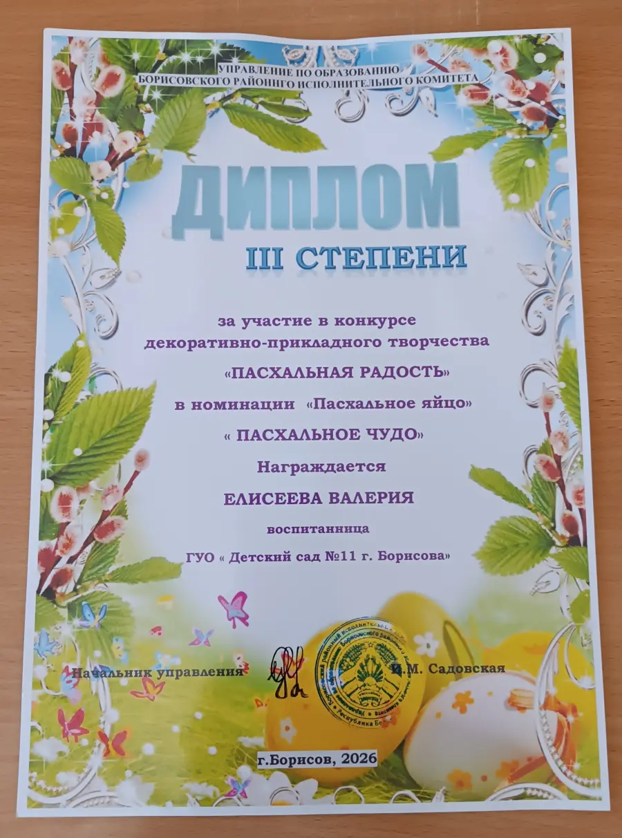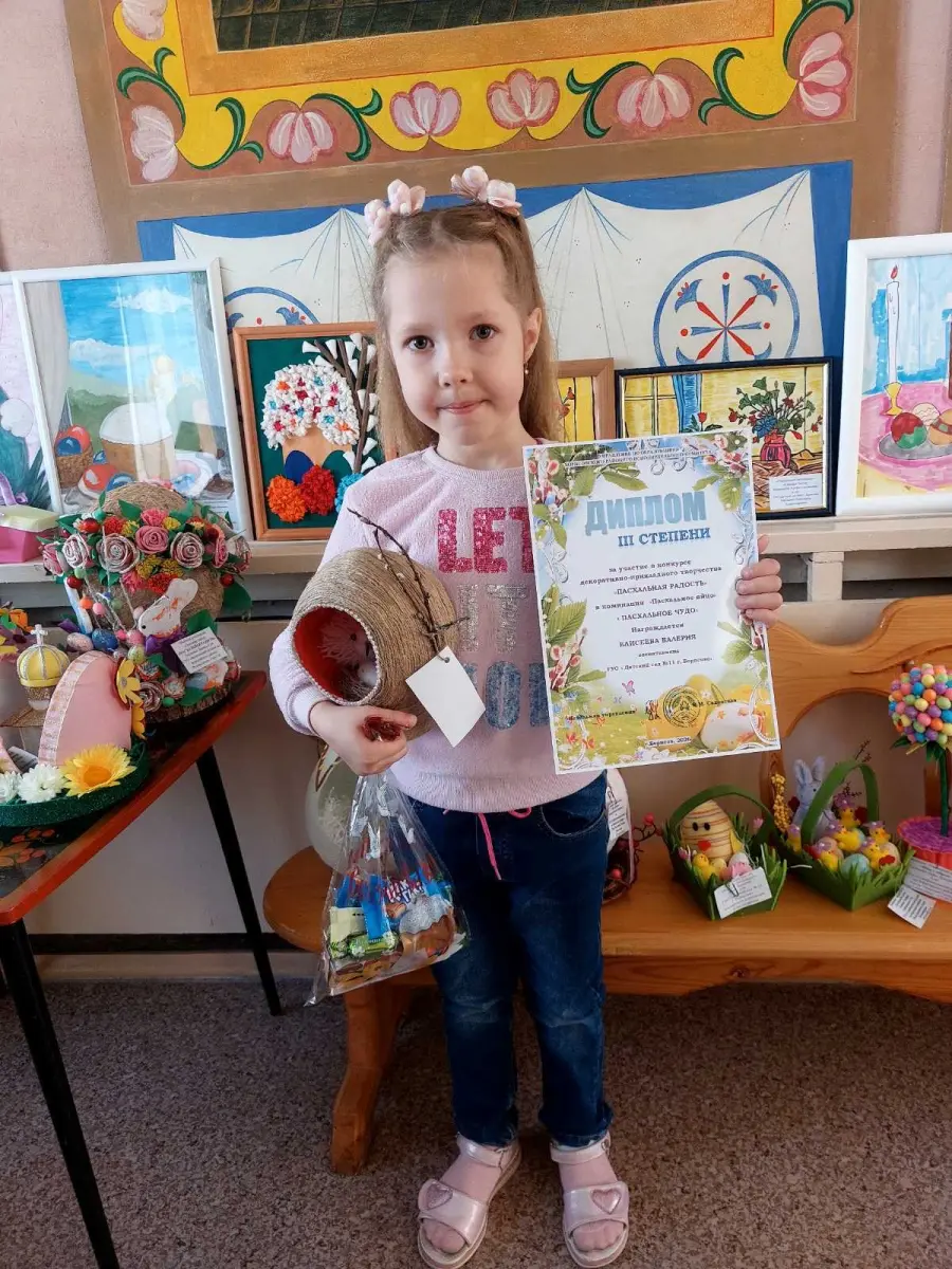 Воспитанница старшей группы «Веселые ребята» Елисеева Валерия под руководством воспитателя дошкольного образования Голубь Галины Станиславовны приняла участие в районном конкурсе декоративно-прикладного творчества «Пасхальная радость».